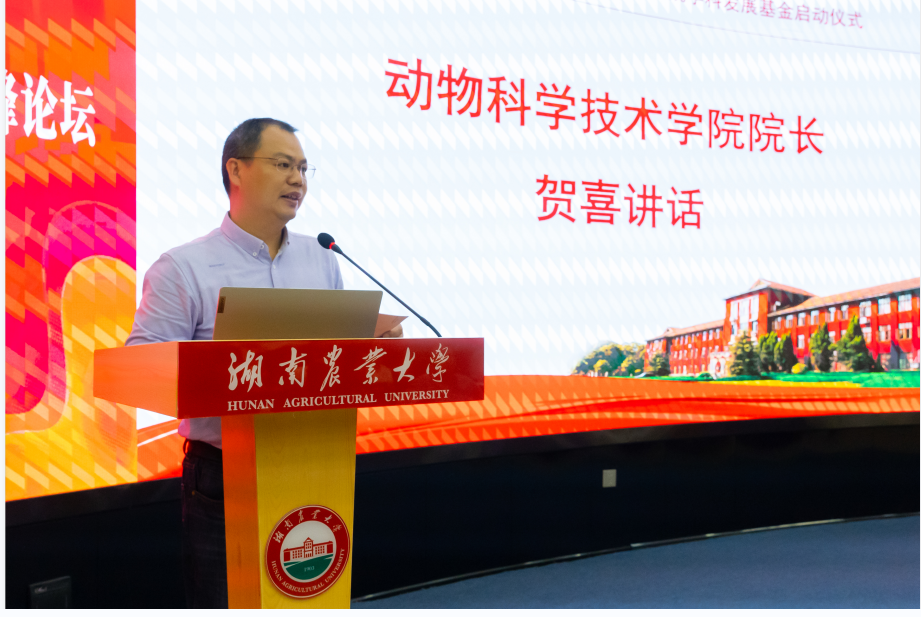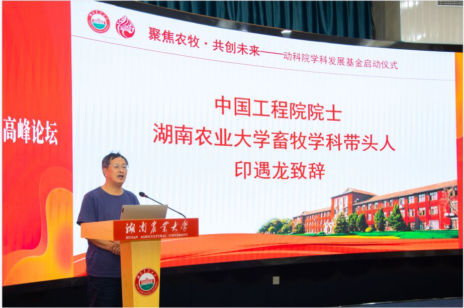 基金发起人印遇龙院士就动科发展基金设立宗旨和农牧行业战略发展发表了重要讲话。他指出“农为国本,种铸基石”。农牧行业发展是粮食安全与农业高质量发展的物质基础,养殖产业价值实现对国家经济、科学和文化发展具有重要意义。设立学科发展基金旨在汇聚企业力量为畜牧学科人才培养、教师队伍建设、人才引进、学术交流、成果凝练申报和平台建设等提供更有力的经费支持,助推教师科研能力、教学水平提升,助推学科人才培养质量和服务产业能力提高,打造实力雄厚的“双一流”学科,促进高校、企业联系,促进产学研融合,加快农牧业现代化进程,优化湖南农业产业链。